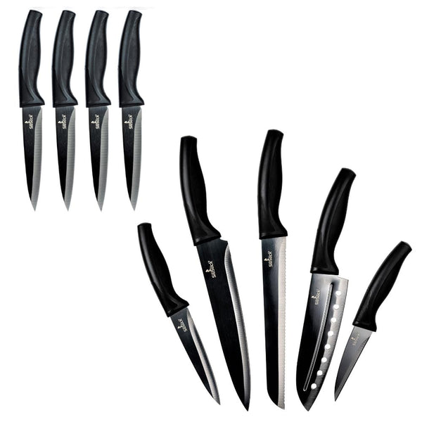 Upgrade your cutting experience with this versatile Kitchen Knife Set & Steak Knives Bundles, with Titanium Coated blades, that includes a 6 pc Steak Knife Set and a 5pc Kitchen Knife Set in stunning black handle, black blade designs. Crafted from food grade stainless steel, these knives deliver exceptional durability and precision sharpness for effortless cutting. The ergonomic, comfort grip handles ensure a secure and comfortable grip, while the included safety sheaths provide protective storage. Impress your guests and elevate your cooking skills with this stylish and practical knife set that is perfect for both home and professional kitchen use.